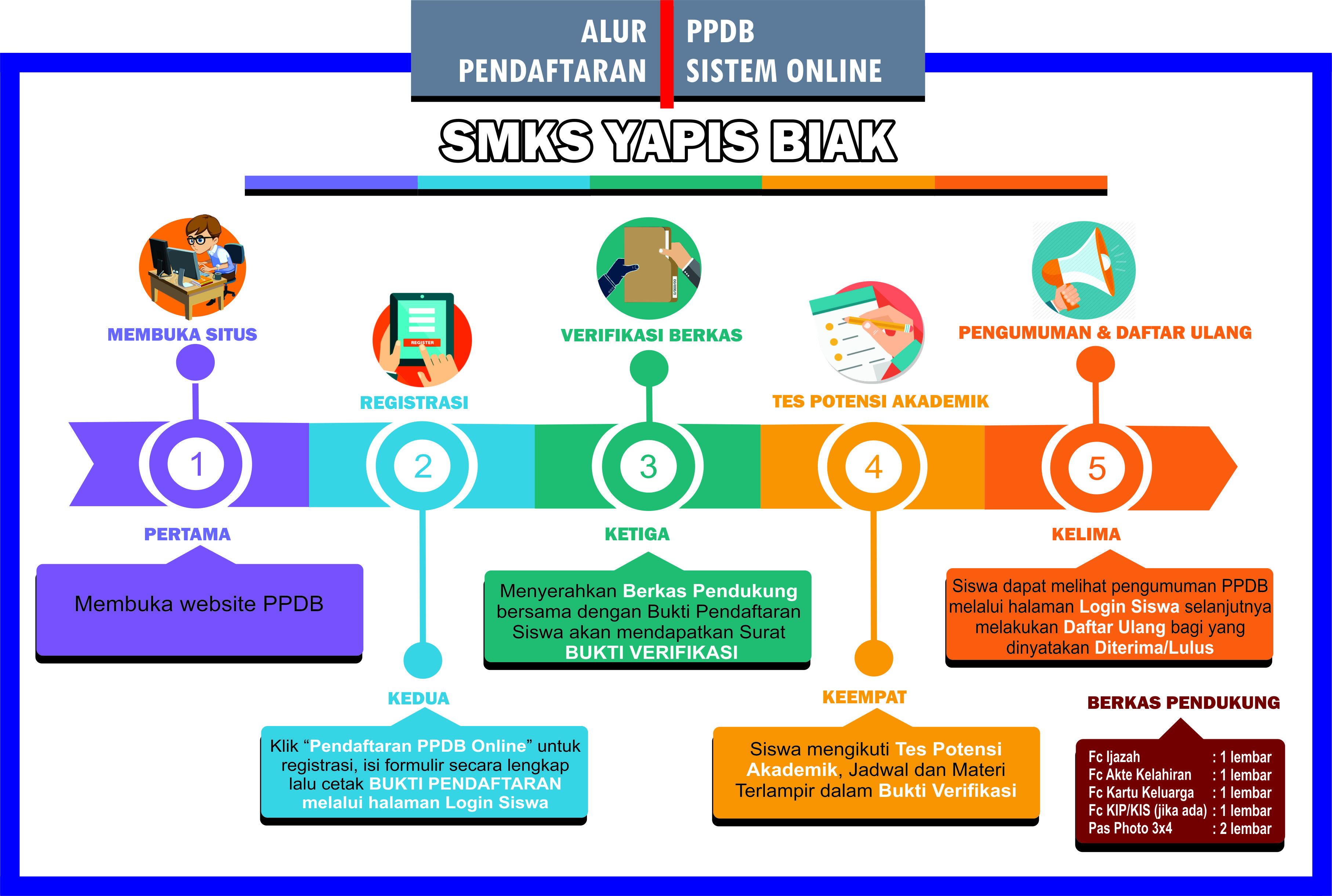 4. Calon siswa datang ke SMKS YAPIS TIK Biak Numfor untuk VERIFIKASI mulai bulan Juni sampai dengan selesai, membawa Bukti pendaftaran & Kelengkapan Berkas antara lain: