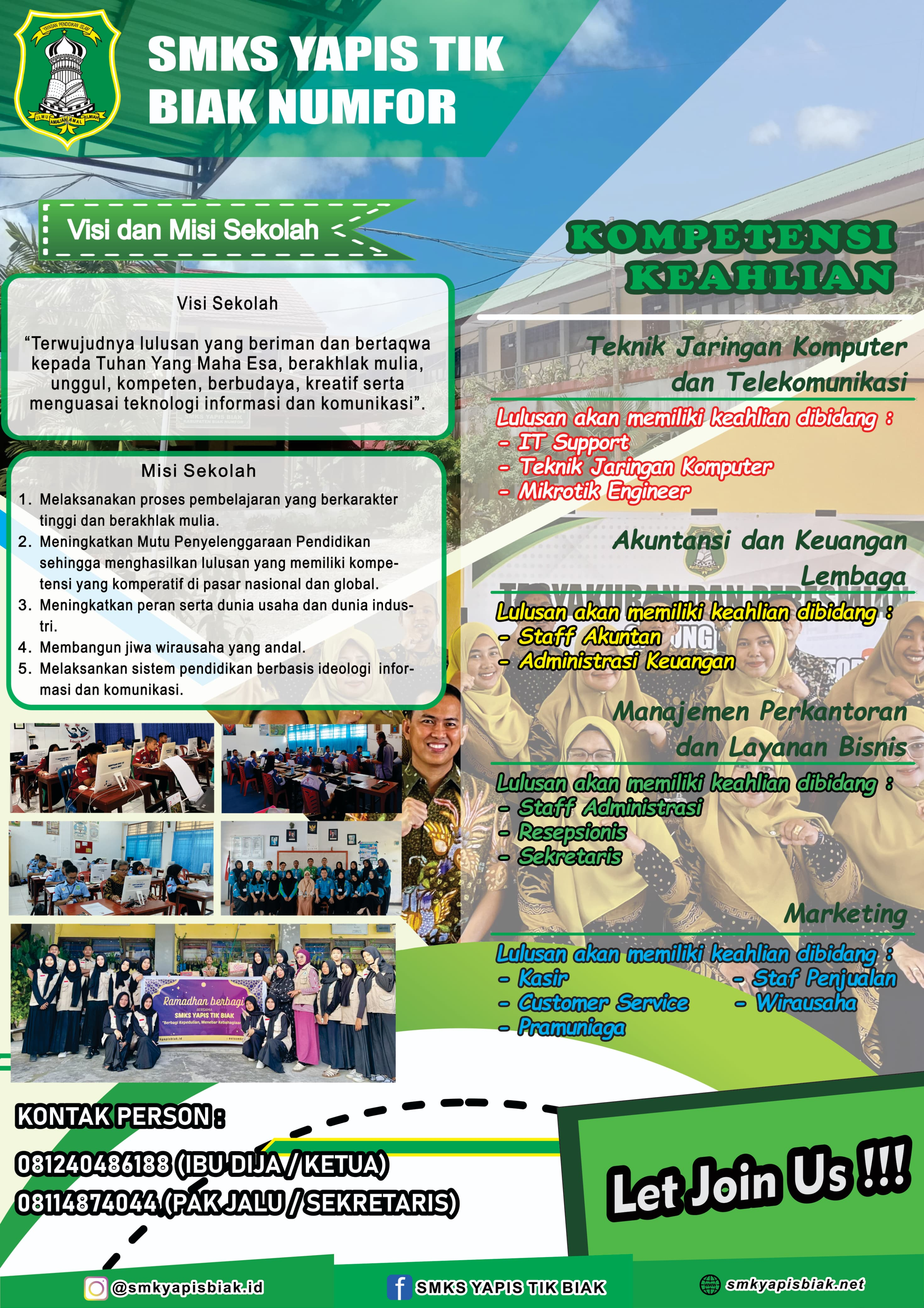 SMKS YAPIS TIK BIAK NUMFOR menyediakan SPMB secara online diharapkan proses SPMB dapat berjalan cepat dan bisa dilakukan dimanapun dan kapanpun selama sesi SPMB Online dibuka. Proses pendaftaran calon siswa baru tidak menggunakan formulir konvensional hanya dengan mengakses website SPMB Online SMKS YAPIS TIK BIAK NUMFOR.